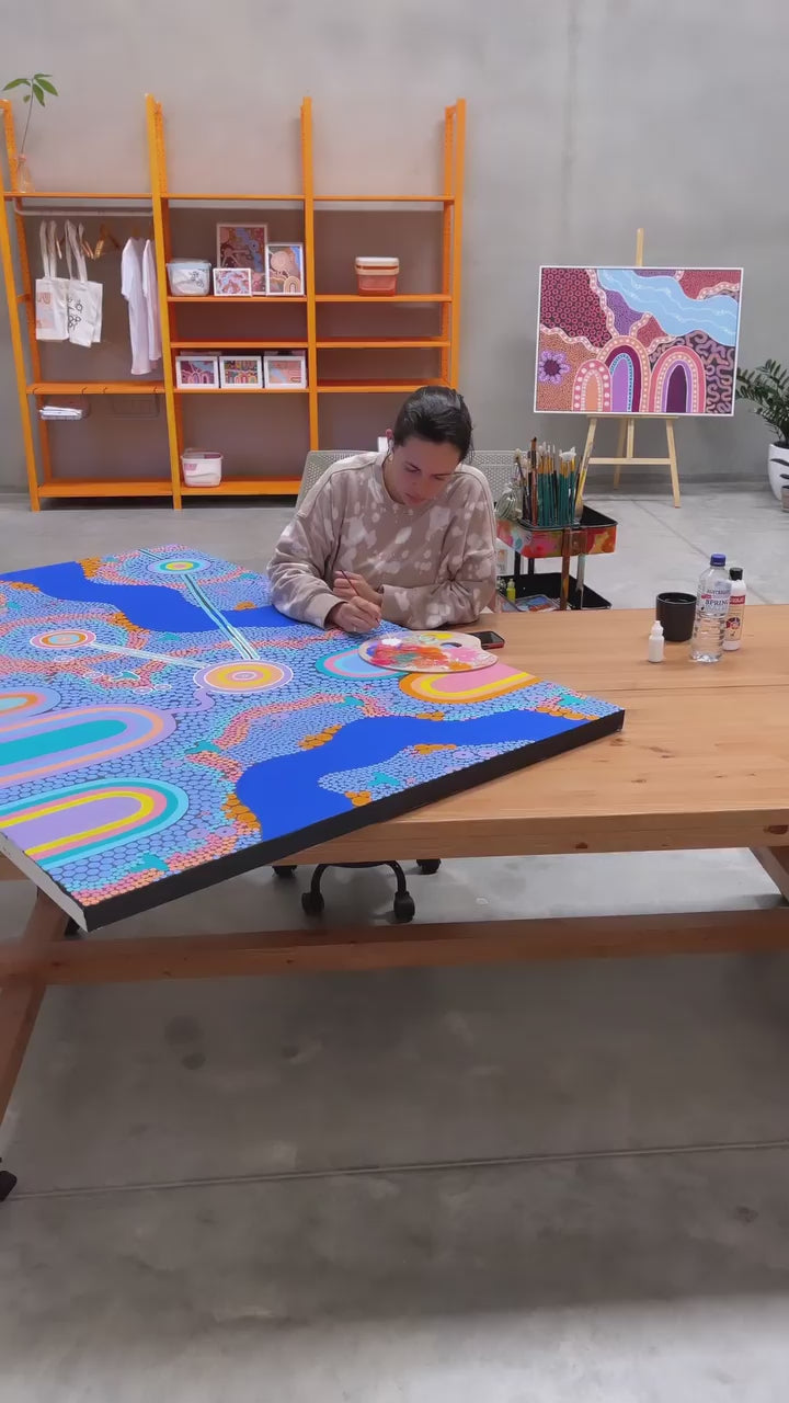 This artwork was created for a couple who spend their time surrounded by family, friends and their canine companion. Across the piece, you will find trees for growth, wildflowers for strength, bush plums for health, rocks on the banks of the river for calmness and animals for movement. All together creating a balance.